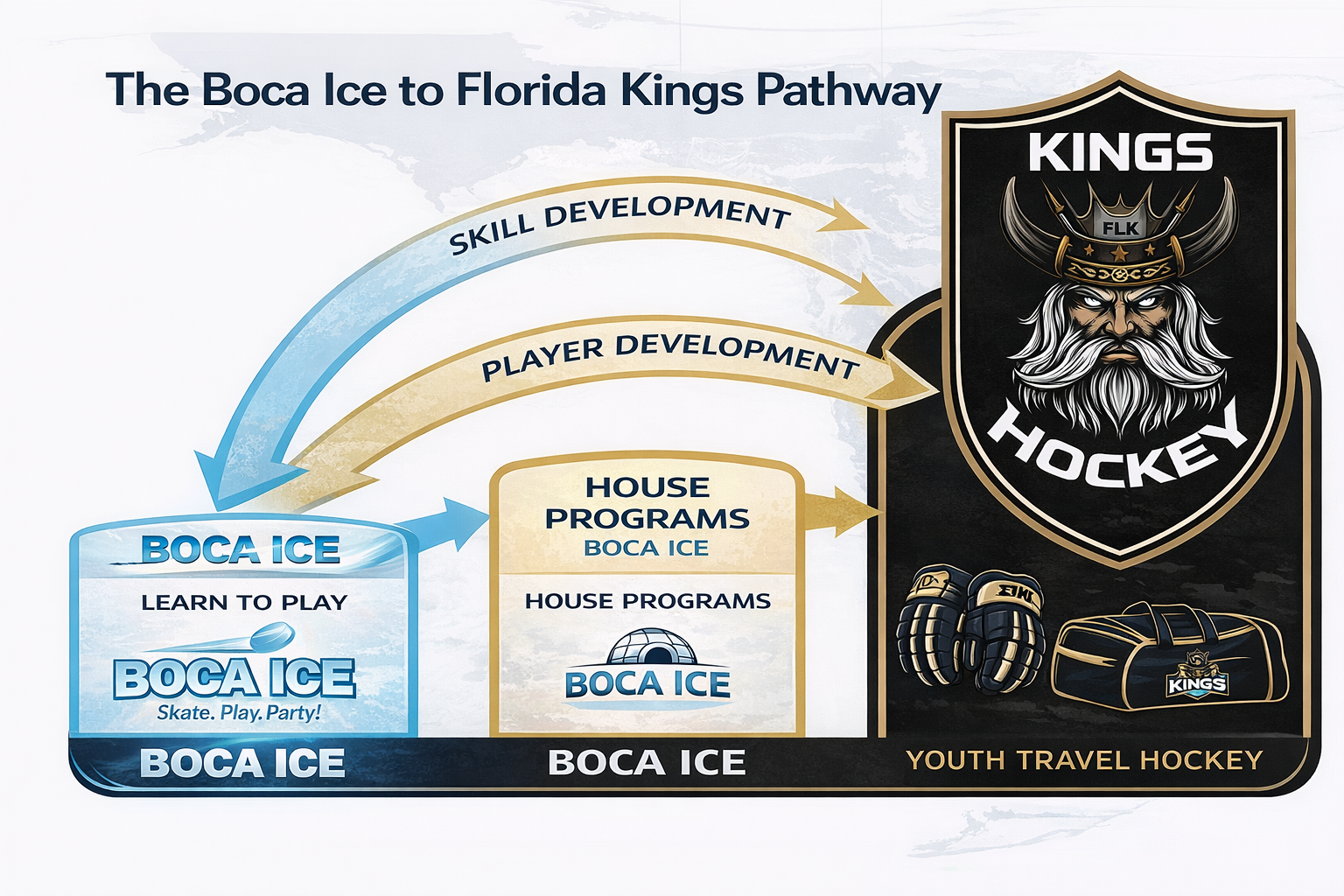 The Florida Kings proudly partner with Boca Ice to provide a seamless development pathway for youth hockey players in South Florida. This partnership allows players to progress through strong foundational programming at Boca Ice and advance into the Florida Kings travel program when ready.