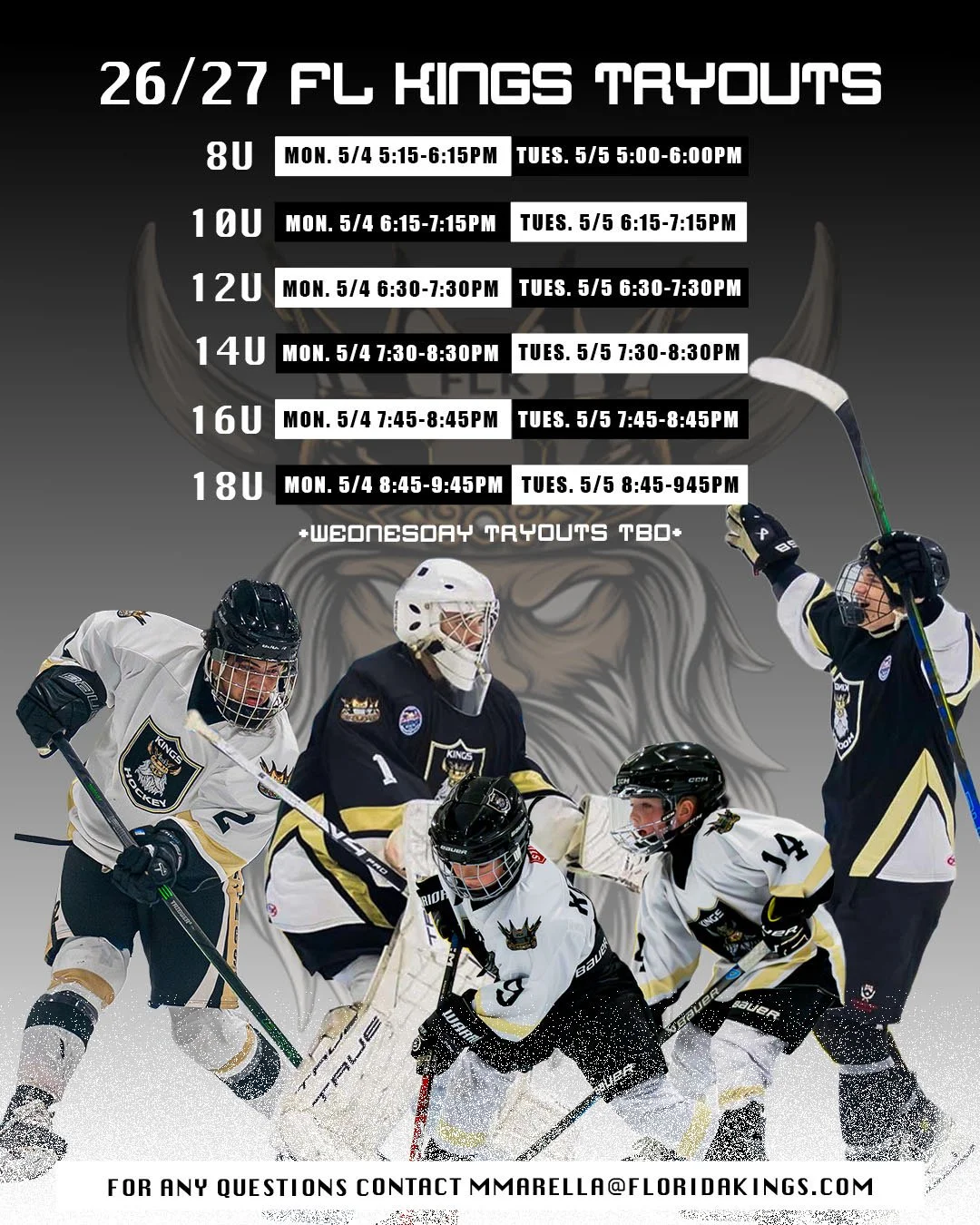 Florida Kings Hockey tryouts are designed to evaluate players in a positive, competitive, and development-focused environment. Our goal is to place each athlete in the setting that best supports their growth, confidence, and long-term success, both on and off the ice.